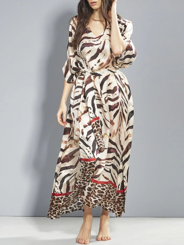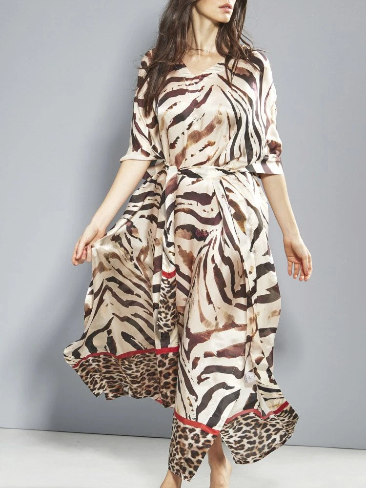 Langer Seiden Kaftan mit einer Neuinterpretation von Animal Print. Das verfremdete Zebramuster ist als platzierter Druck auf einem Seidensatin aus 100% Seide ausgeführt, wodurch dieser Seidenkaftan besonders edel wirkt. Der Kaftan hat einen V-Ausschnitt und kann mit dem zugehörigen Bindegürtel zu einem bequemen Hauskleid oder Sommerkleid drapiert werden.