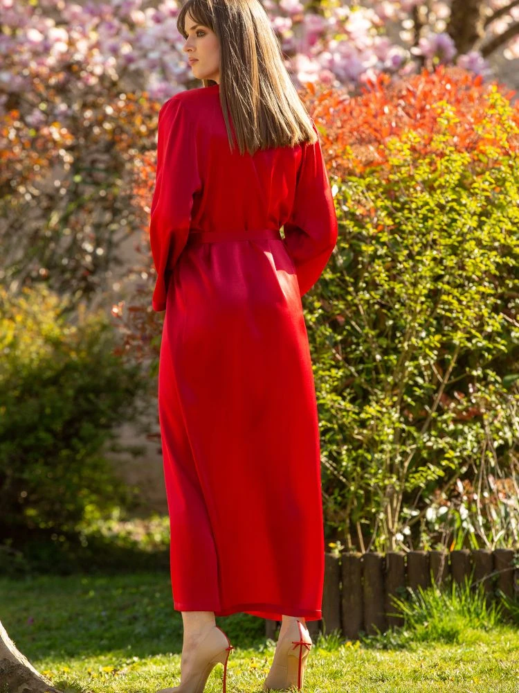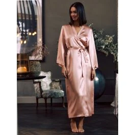 Der lange Seidenmorgenmantel Laurian hat ein schmales Revers im Kimono-Stil, lange Ärmel und wird mit einem Bindegürtel geschlossen. Dieser Seiden-Morgenmantel wird in den Größen 34 bis 46 angeboten (deutsche Damengrößen) und ist in den folgenden Farben erhältlich: