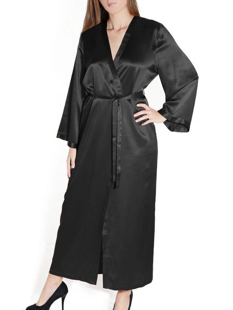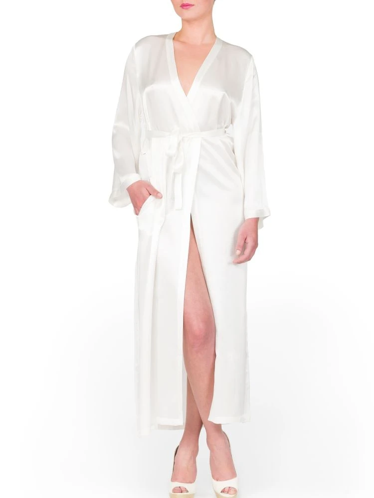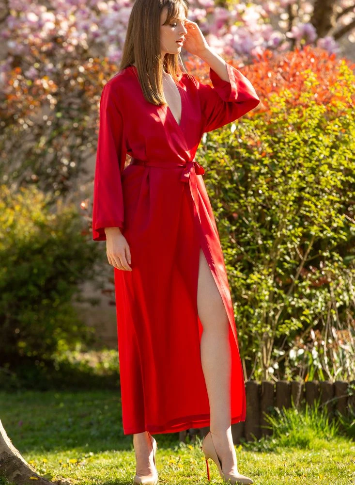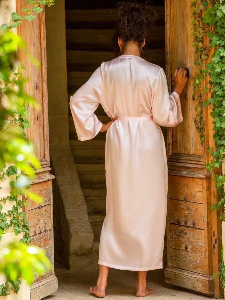 Der lange Seiden-Morgenmantel Laurian der französischen Edel-Marke Marjolaine ist aus feinem Seidensatin (100% Seide) gefertigt. Der hochwertig verarbeitete lange Morgenmantel ist die perfekte Ergänzung zu den Seiden-Nachthemden und Negligés von Marjolaine.
