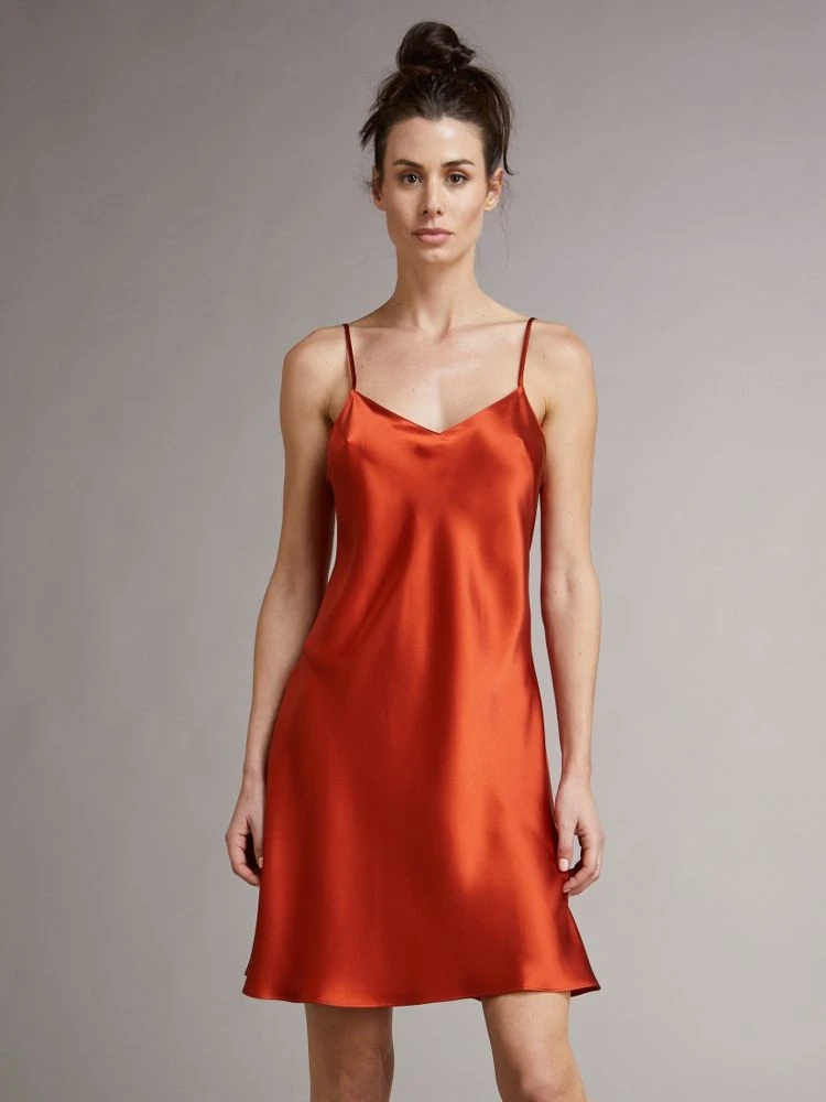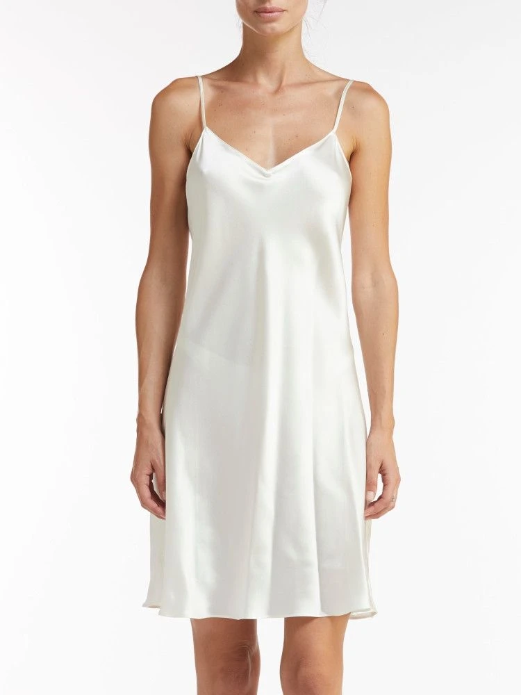 Das knielange Seidennachthemd Caroline ist klassisch geradlinig geschnitten und kann als Nachthemd oder Unterkleid getragen werden. Es hat fein gearbeitete in der Länge verstellbare Spaghetti-Träger und ist in Basicfarben oder saisonalen Modefarben erhältlich.