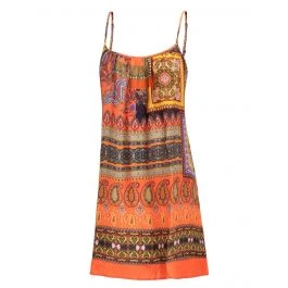 Das Seidenkleid Chili kann als Nachtwäsche getragen werden, als Sommerkleid oder wird in Kombination mit Bademode zu einem schicken Kleidungsstück für den Urlaub. Das ornamentale Paisley Muster hat die Farben orange, gelb, rot und violett, kombiniert mit gold.