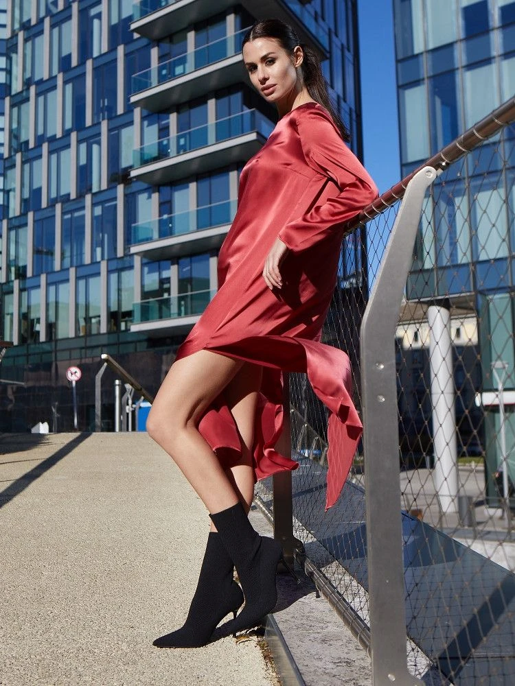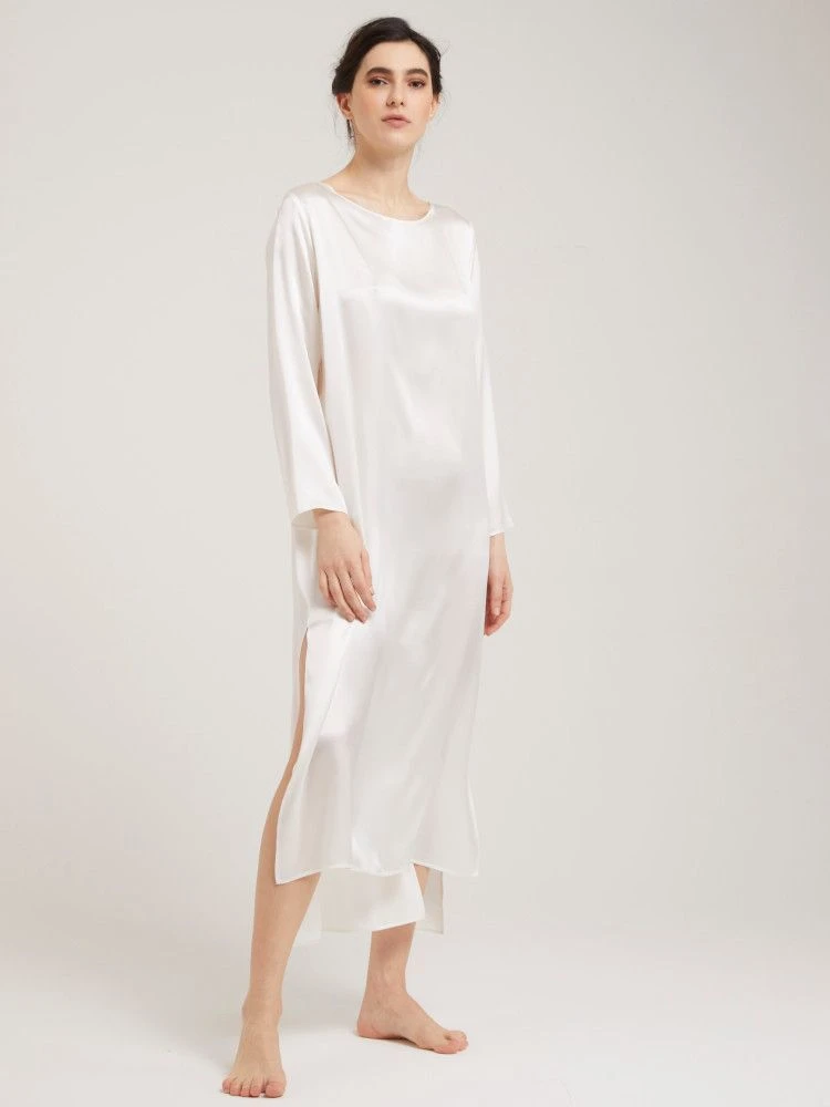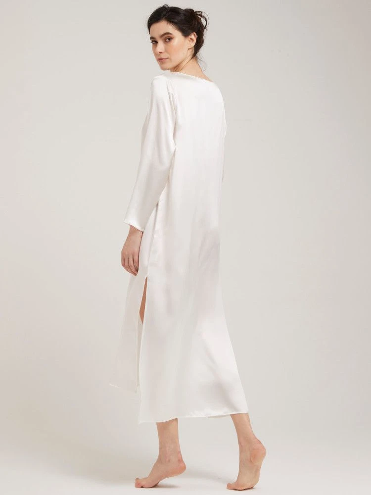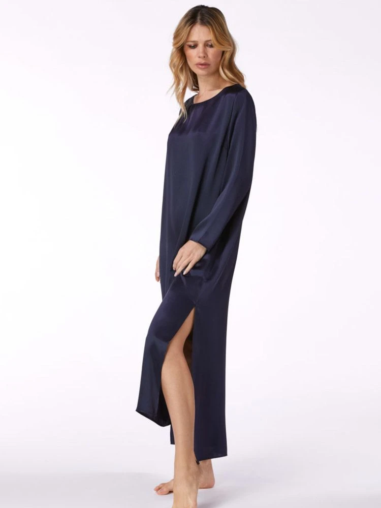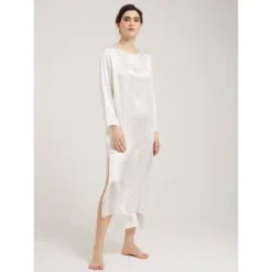 Das Nachtkleid hat lange Ärmel und bietet durch das hochwertige Material einen femininen und edlen Look. Dieses Modell ist in den Größen S bis XXL erhältlich (italienische Herstellergrößen). Die Verarbeitung ist fein und edel und daher kann es auch als Loungewear, Strandkleid oder Seidenkleid getragen werden. Da dieses Seidenkleid ungefüttert ist, ist es auch als Nachthemd verwendbar.