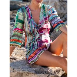 Die Seiden-Tunika mit ihrem zeitlosen Druck ist sowohl als sommerliche Oberbekleidung als auch als angenehme Nachtwäsche oder Homewear zu tragen und ergänzt die aktuelle Bademode optimal. Sie ist in den Größen 36 bis 42 erhältlich.
