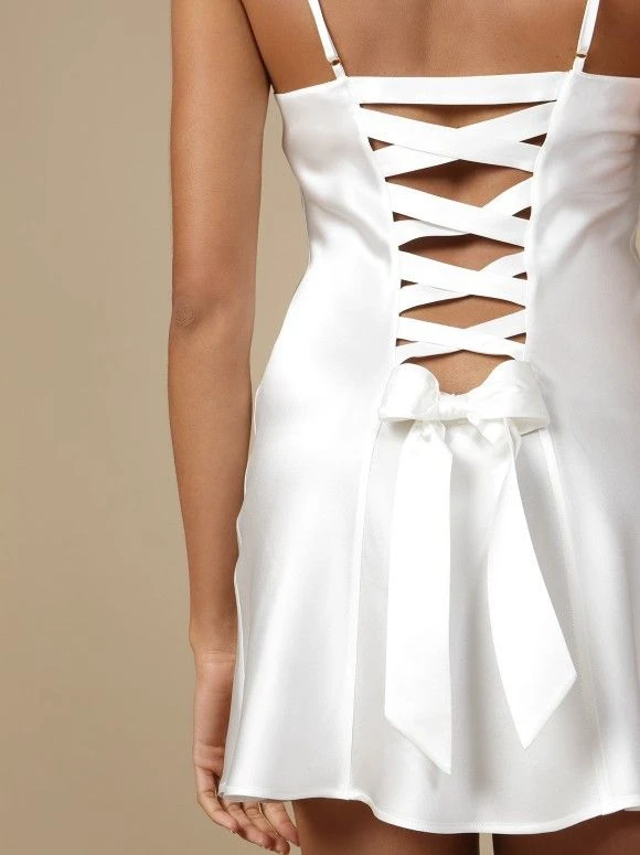 Das Highlight dieses ansonsten schlichten Nachthemdes ist die raffinierte Rückengestaltung mit überkreuzten, geflochtenen Bändern und einer großen Schleife.