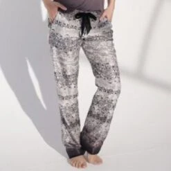 Das Hose mit Gummibund von Gattina besteht aus fein glänzendem Satin (65% Baumwolle, 35% Seide). Sie hat einen grafischen Druck in grau, schwarz und creme und ist in in den Größen 36 bis 48 (deutsche Damenkonfektionsgrößen) erhältlich. Ausverkaufte Größen sind hier nicht nachbestellbar. Diese Hose kann als Schlafwäsche, Lounge-Wear oder Sommerkleidung getragen werden.