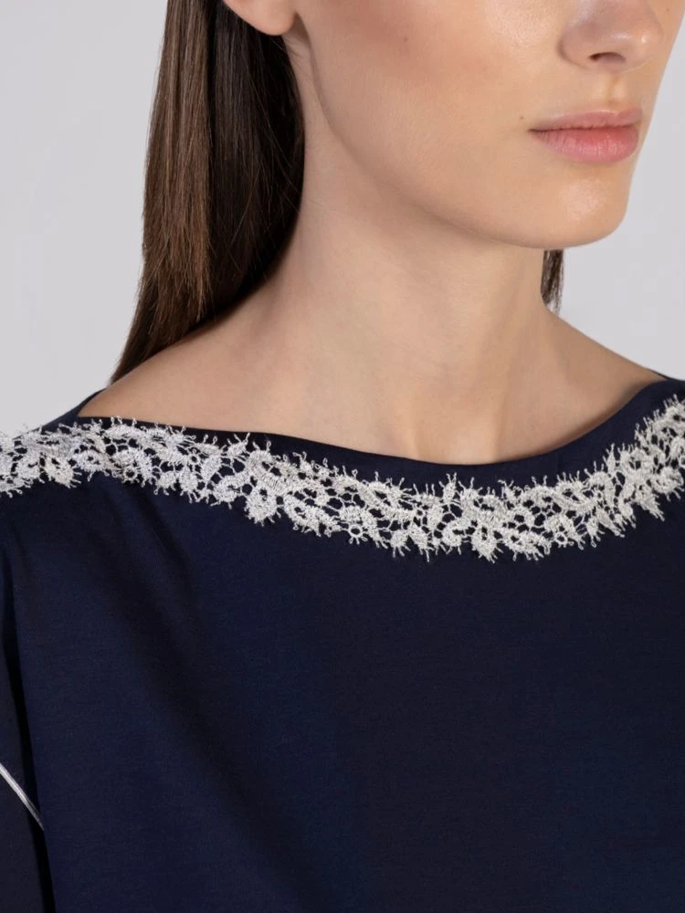 Der Damen Pyjama Blu von Verdiani Donna besteht aus dunkelblauem Baumwolle Jersey (100% Cotton). Er ist Made in Italy und in den Größen 36 bis 44 erhältlich. Dieser bezaubernde Pyjama ist ärmellos und hat eine lange Hose mit Gummibund. Das Oberteil ist ca. 65 cm lang und der U-Boot Ausschnitt ist mit einer Blütenspitze (70% Seide, 30% Nylon) gestaltet. Da die Spitze einen Seidenanteil hat, muss dieser Pyjama mit Seidenwaschmittel gewaschen werden!