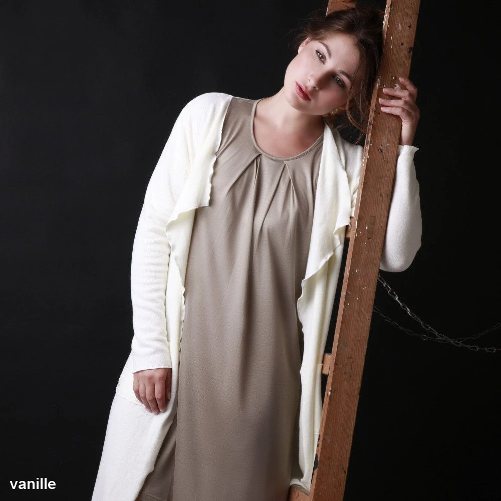 Das Grundmaterial für den Morgenmantel Casual ist ein leichter, weicher Feinstrick aus Baumwolle-Viscose-Mischung, welcher in den Farben fango oder vanille erhältlich ist. Der kurze Mantel hat lange Ärmel. Dieses Modell ist in den Größen 36 – 48 (deutsche Größen) erhältlich. Ausverkaufte Größen sind nicht nachbestellbar.