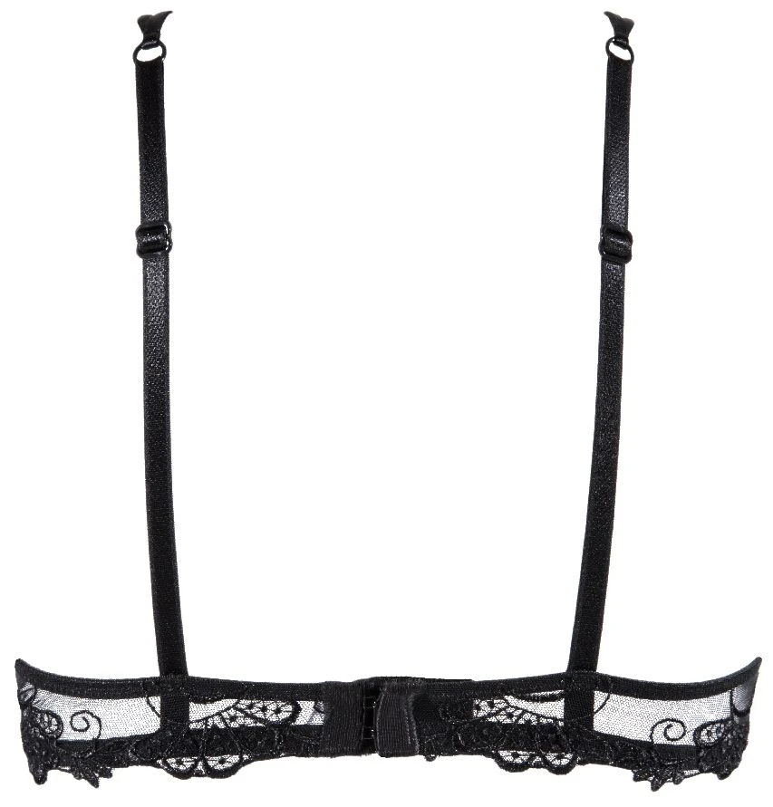 Der BH besteht vorne, sowie an den Seiten aus Tüll, wobei der Tüll vorne an den Cups super fein und daher transparent ist. In Kombination mit der Stickerei wird so ein leichter Tattooeffekt auf der Haut erzeugt. Die Cups in Halbschalenform sind unwattiert und haben Bügel. Zarte Stickereien umspielen die Cups und komplimentieren die Brust. Vorne am Mittelsteg wird das Dekolleté mit einem kleinenKristallelement geziert. Die Träger aus Satin sind längenverstellbar und ebenfalls mit einer kleinen Stickerei versehen. Dieses detailreiche Zusammenspiel der unterschiedlichen Materialien und Akzente formt sich zu einer aufregenden Basickollektion.