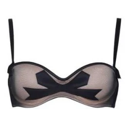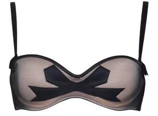Die glatten Cups sind aus hautfarbenem und schwarzem, transparentem Tüll gefertigt, in welche mittig eine große, flach verarbeitete Zierschleife eingearbeitet ist. Hierdurch wirkt dieser BH transparenter, als er eigentlich ist (Nude-Look). Dieser hochwertig verarbeitete Bügel-BH von Chantal Thomass wird mit C- oder D-Cup in den folgenden Größen angeboten: