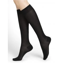 Diese langen Kniestrümpfe sind glatt und feingestrickt und in den Größe 36/38 oder 39/41 in der Farbe schwarz erhältlich.