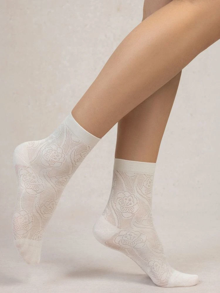 Diese kurzen Socken mit eingestricktem Blumenmuster sind in den Größe 36/38 oder 39/41 in den Farben schnee oder schwarz erhältlich.