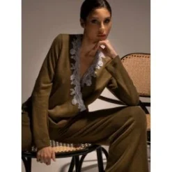 Der Hausanzug Delia von Verdiani ist aua einem angenehmen und hochwertigen Viscosegestrick (50% Viscose, 25% Polyester, 25% Polyamid) gefertigt. Der Hausanzug besteht aus einem Oberteil mit langen Ärmlen und einer langen Hose. Der Ausschnitt des Oberteils ist in einem Wickeldesign gehalten und mit einer weißen Blumenspitze verziert. Die Hose hat einem Gummiband und hat auf beiden Seiten Taschen.