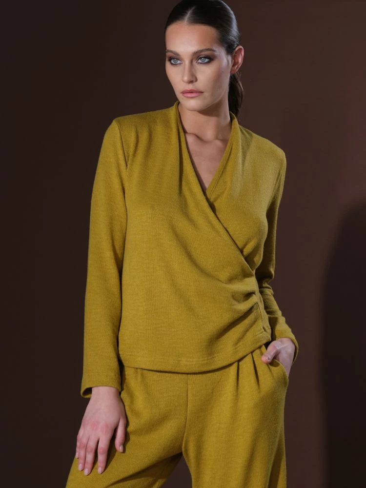 Der Lounge-Anzug hat lange Ärmel. Das Oberteil ist im Wickellook gestaltet und die Hose hat weite Beine und einen Gummibund. Der Anzug ist eine wärmende Loungewear für jede Jahreszeit kann aber auch als Tagbekleidung in verschiedenen Kombinationen getragen werden. Er ist bei uns in der Farbe Senf Gelb erhältlich.