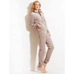Dieser Hausanzug mit langen Ärmeln und Beinen ist in den Farben noisette oder schwarz erhältlich. Das Oberteil ist ca. 65 cm lang, hat einen durchgehenden Reißverschluss, lange Ärmel und ist an den Ärmelenden mit glänzendem Satin besetzt. Die Hose hat einen Gummibund, ist lang geschnitten und hat die Satin-Details an den Beinenden. Dieser praktische Hausanzug hat eingearbeitete Taschen sowohl an der Jacke als auch an der Hose und ist optimal für die Übergangszeit und den Winter.