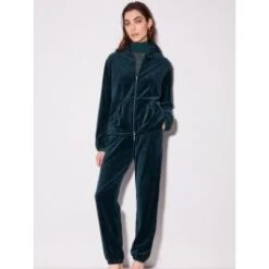 Das Loungewear-Set mit langen Ärmeln und Beinen ist in dunklem waldgrün erhältlich. Das Oberteil ist ca. 65 cm lang, hat einen durchgehenden Reißverschluss mit Details in Gold-Optik und lange Ärmel, welche mit Gummibündchen enden. Die Hose besitzt sowohl am Hosenbund, als auch an den Beinenden einen elastischen Gummizug. Dieser praktische Hausanzug hat eingearbeitete Taschen sowohl an der Jacke als auch an der Hose und ist optimal für die Übergangszeit und den Winter.