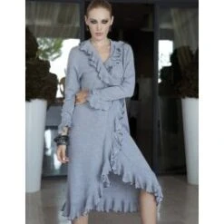 Das Grundmaterial für den Hausmantel Marisa ist ein leichter Feinstrick mit der kostbaren Wolle vom Merino-Schaf und Kaschmir. Erhältlich ist er in cremigen Sahne oder zeitlosem Grau. Der kurze Mantel hat lange Ärmel und ist etwa knielang. Dieses Modell ist in den Größen 34 – 42 (deutsche Größen) erhältlich.