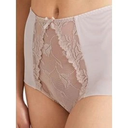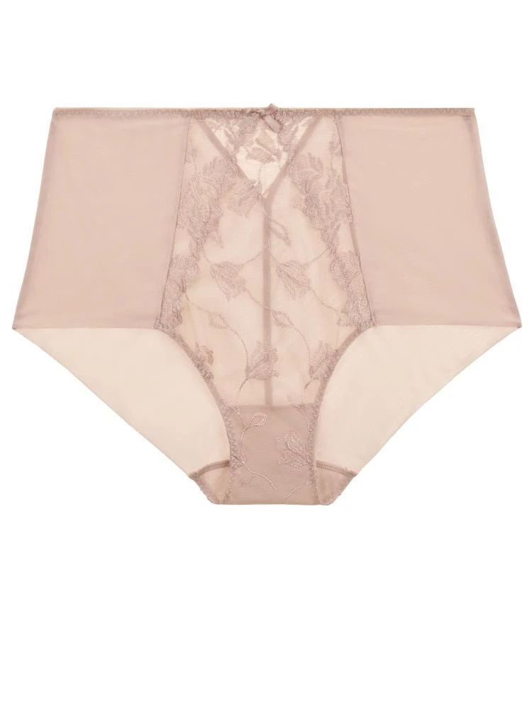 Der hohe Taillenslip ist aus Tüll und bestickter Tüllspitze gefertigt. Der Tüll ist seitlich und hinten in Futteralverarbeitung verwendet für besonders flache Kanten. Der Slip ist semitransparent und hat einen Innenzwickel aus Baumwolljersey.