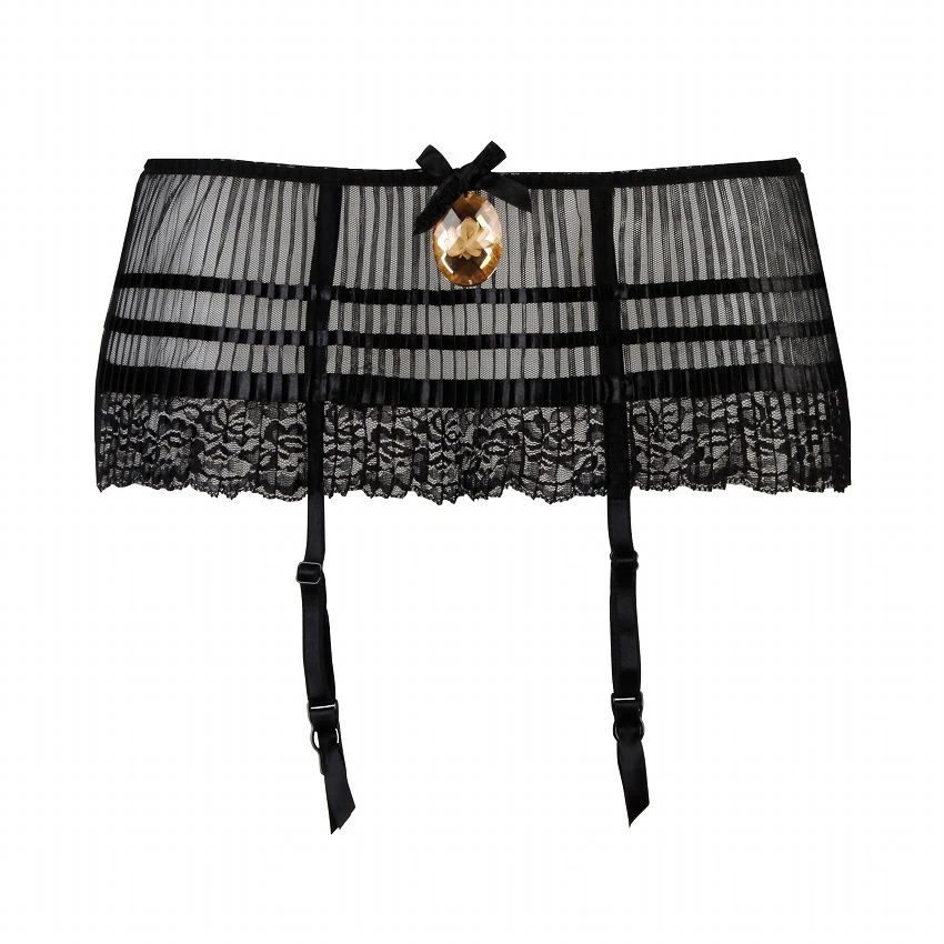 Dieser Hüftgürtel besteht schwarzem Tüll, welcher in schmale Plissee-Falten gelegt ist. Der untere Saum ist mit schwarzer Spitze benäht. Die vier Strapse sind längenverstellbar und elastisch. Auf der Rückseite wird dieser Hüftgürtel mit einem Schiebehaken geschlossen. Vorne mittig wird er von einem kleinen Satin-Schleifchen und einem großen, bernsteinfarbenen Kristall-Medaillon geschmückt.