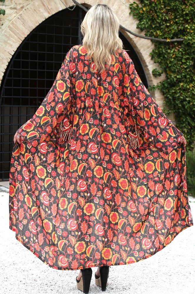 Der lange Kimono Aurora in schwarz-rot der italienischen Luxus-Marke Laetitia Beachwear ist aus feinem Batist (65% Baumwolle, 35 % Seide) gefertigt. Der exklusive Kimono ist mit einem floralen Print bedruckt und hat einen Bindegürtel. Die Häkelsäume an den Taschen sind in echter Handarbeit gefertigt. Der Ausschnitt ist verziert mit Häkelblumen und Zierperlen.