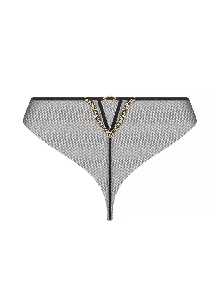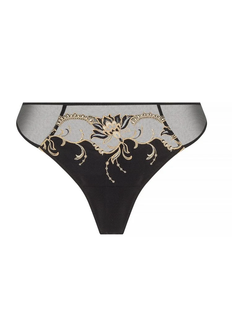 Der elegante Slip Eblouissante Icone von Lise Charmel ist aus glänzenden Stretchseidensatin, floraler Spitze und Tüll (42% Seide, 29% Polyamid, 11% Baumwolle, 10% Polyester, 8% Elasthan) gefertigt. Dieser verführerische Slip ist knapp geschnitten, geschlossen und halbtransparent. Der Innenzwickel ist aus Baumwolle. Ganz besonders ist die elegante Kombination aus einer goldenen Blumenspitze und feinem Tüll.