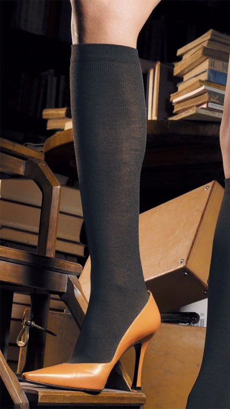 Der Kniestrumpf Jennifer von Trasparenze ist durch den hohen Anteil Merino-Wolle besonders weich und wärmend. Diese edle Strumpfqualität wird daher auch von empfindlichen Hauttypen gut vertragen.