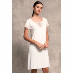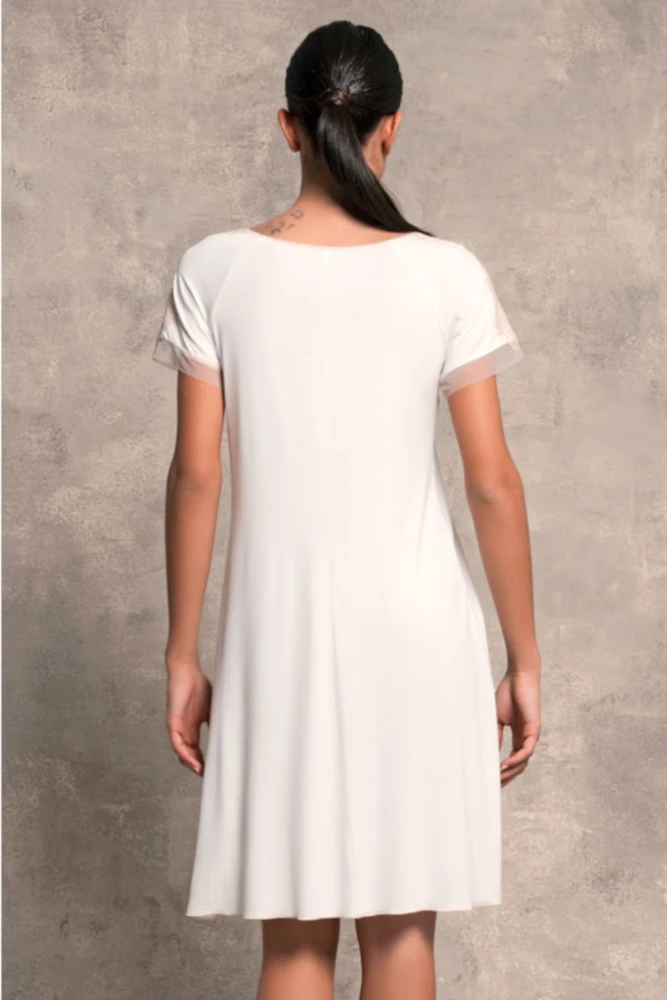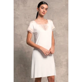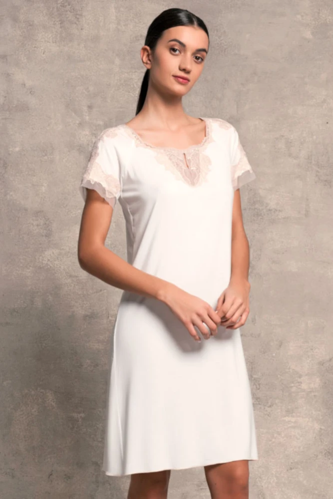 Das kurze Nachtkleid Rosa von Paladini ist aus einem sehr weichen und leicht elastischen Modaljersey (aus 94% Modal, 6% Elastan) gefertigt. Das Nachthemd ist ca. 90 cm lang, kurze Armel und ist mit floraler Spitze verziert. Der runde mit Spitze verzierte Ausschnitt kann mithilfe eines kleinen Knopfes geöffnet oder geschlossen werden. Die kurzen Ärmel sind ebenfalls mit Spitze verziert und enden in durchsichtigen Mikrofasertüll.