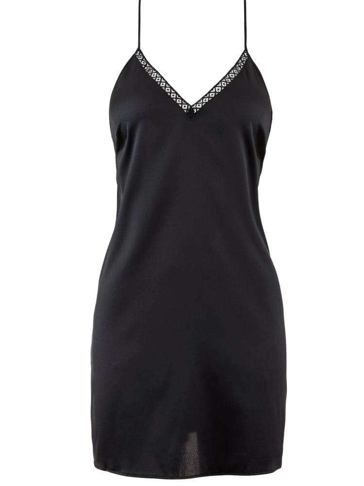 Feine Zierborten aus Guipure Spitze zieren Ausschnitt und Rücken. Der tief ausgeschnittene Rücken mit dem Band aus Lochstickerei enthüllt die Haut auf elegante, sinnliche Weise. Das Seiden Negligé ist ca. 84 cm lang und hat feine, verstellbare Spaghettiträger mit kleinen goldenen Zamakringen. Aufgrund des flexiblen Stoffes und des modernen Schnitts kann dieses Nachthemd auch als Unterkleid getragen werden.
