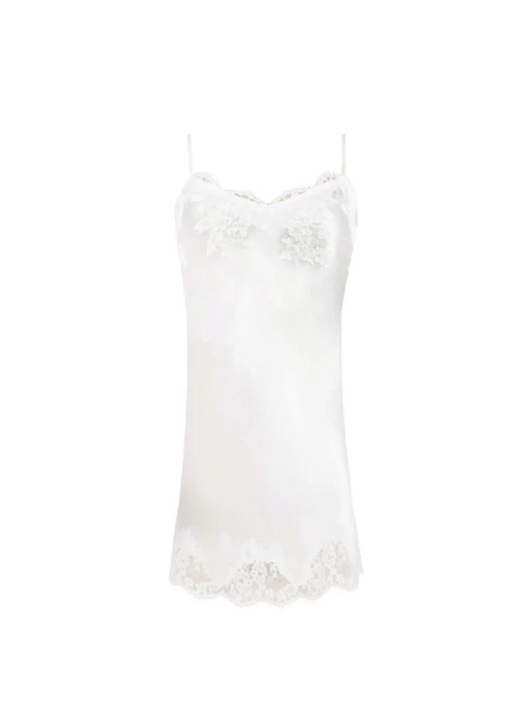 Das bezaubernde Negligé aus Seide (79% Seidenanteil) ist ca 95 cm lang, und reicht somit bis zur Mitte des Oberschenkels. Es hat einen V-Ausschnitt, welcher mit floraler Eye-Lash Spitze besetzt ist. Die Spaghettiträger des Negligés sind längenverstellbar. Auch am Saum des kurzen Nachthemdes ziert die feine Spitze das Lingerie Teil. Dieses zarte Negligé kann aufgrund des feinen Materials und des dezenten Schnittes vielseitig kombiniert werden. Produkte der selben Kollektion finden Sie seperat in unserem Shop. Das edle Zusammenspiel der glänzenden Seide und der floralen Eye-Lash Spitze formt sich zu einem femininen Negligé, der sowohl zu Kimonos oder Dessous getragen werden kann.