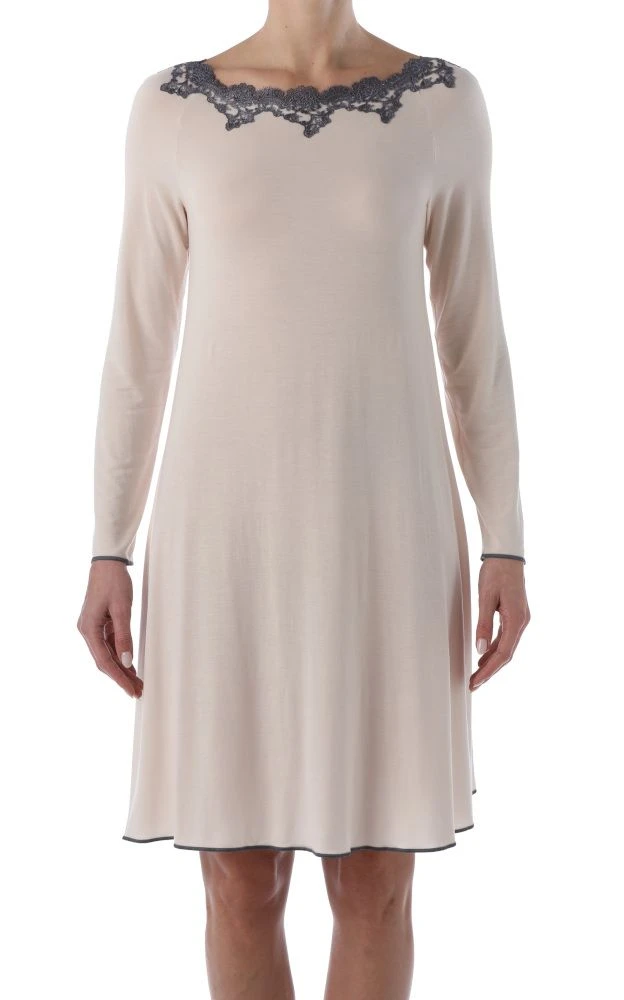 Das Nachtshirt Eva in creme ist am Ausschnitt mit grauer Blütenspitze verziert. Da das Kleid zur modischen Kollektion von Imec gehört, sind ausvekaufte Größen leider nicht nachbestellbar. Bei uns gibt es dieses Kleid in den Größen 2 bis 6.