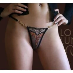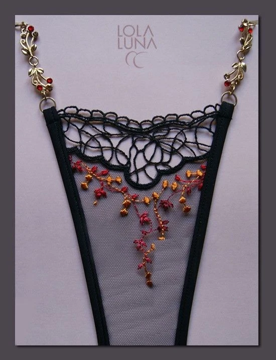 Feine rote und cognac-farbene Blütenranken, gestickt auf schwarzem, luftigem Tüll, verbinden sich hier mit floralen Schmuckelementen… Der Lola Luna String „Juliette“ besteht aus luftigem, besticktem Tüll und filigraner Richelieu-Spitze.
