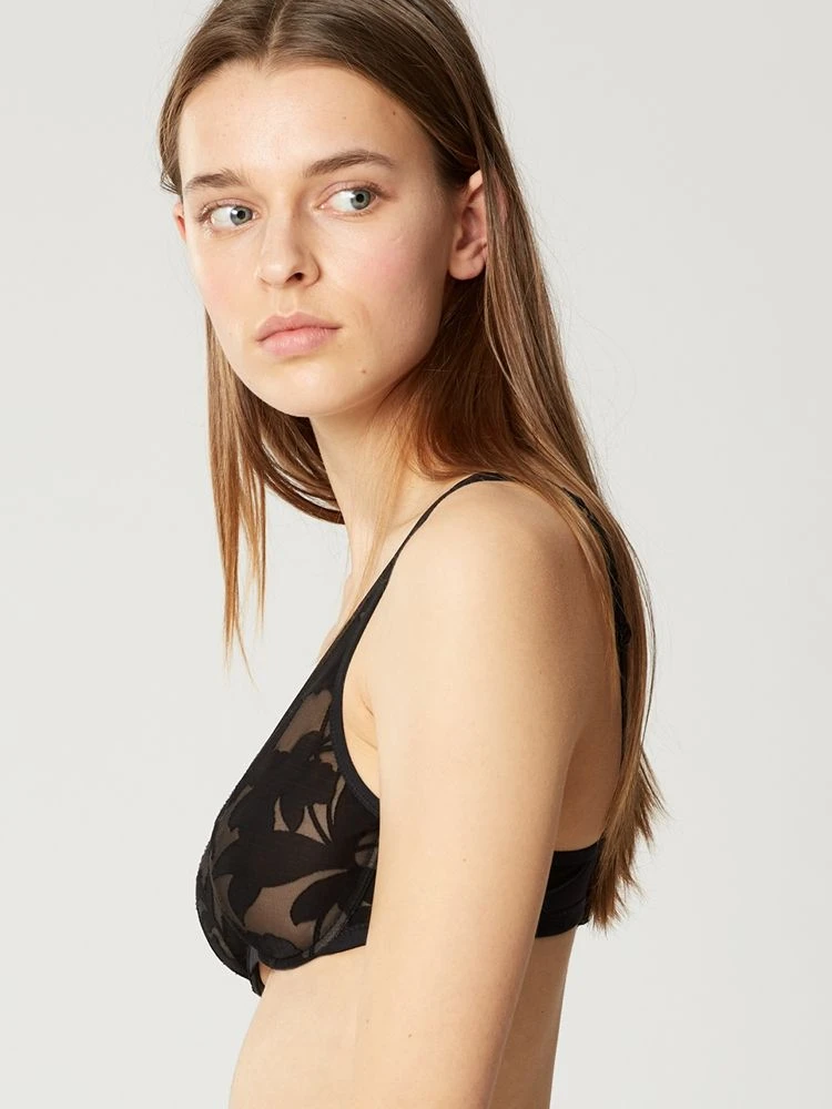 Der Bügel BH Venus ist eine luxuriöse Lingerie der französischen Edel-Dessous Marke Maisonlejaby. Der BH hat unwattierte 3/4-Cups. Die Cups mit Bügel sind aus Ausbrenner Tüll mit floralen Blütenmotiven gearbeitet, welcher mit einem hautfarbenem Tüll hinterlegt.