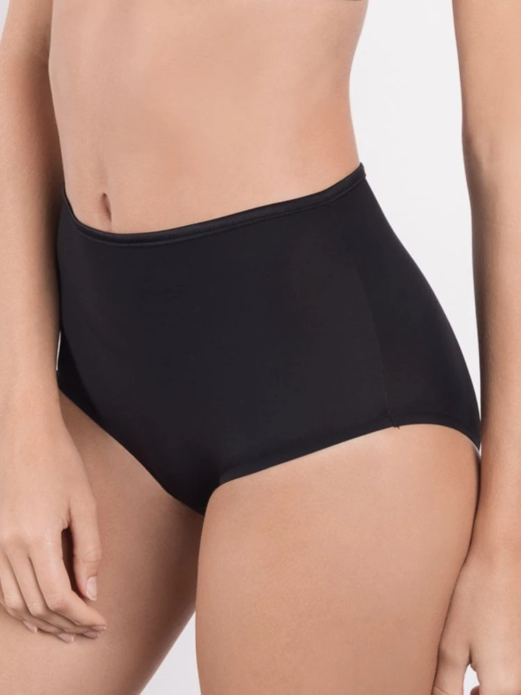 Dieser hohe Slip in Hüft-Slip Form besteht aus weichem Microfaser-Feinjersey, der einen zarten Glanz hat. Der hohe Slip hat an den Beinausschnitten extra flache, laminierte Nähte und ist im Bund mit glänzendem Satin eingefasst. Er hat einen Innenzwickel aus Baumwolljersey.