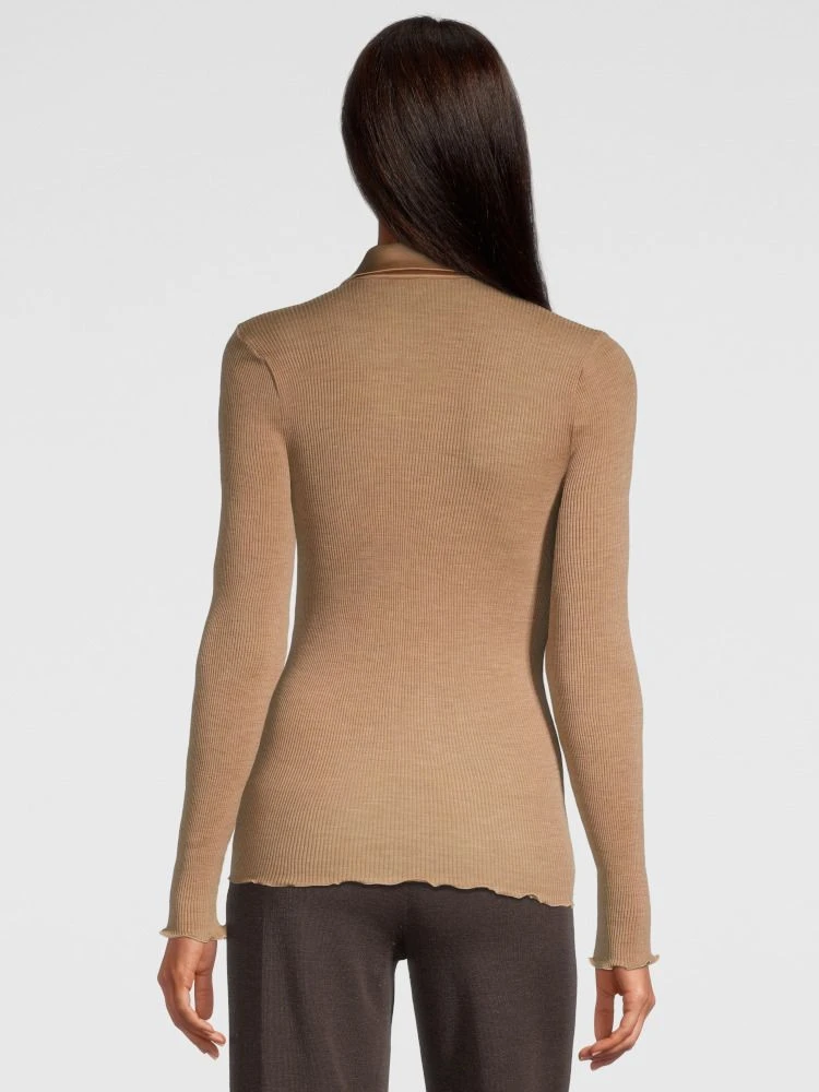 Der Langarm Cardigan Wolle-Seide besteht aus einem besonders hochwertigen, rundgestrickten Jersey aus 70% extrafeiner, tasmanischer Merinowolle und 30% Seide. Das kurze Strickjäckchen besteht aus rundgestricktem Rippjersey und ist seitlich nahtlos. Dieser edle Cardigan hat einen Kragen aus Satin und die Gesamtlänge ist ca. 62 cm. Vorne wird er mit zierlichen Knöpfen geschlossen.