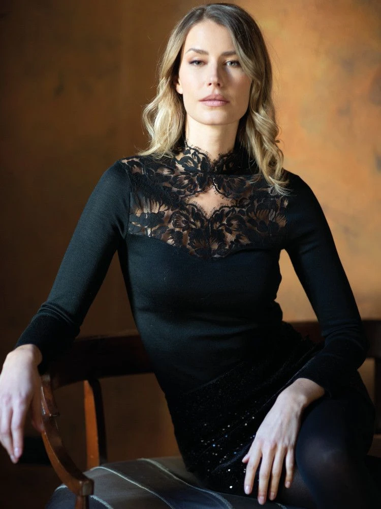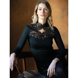 Das Stehkragen Shirt Wolle-Seide besteht aus einem besonders hochwertigen glatten Jersey aus 70% extrafeiner Merinowolle und 30% Seide in Kombination mit einer exklusiven französischen Caudry Spitze. Dieses edle Shirt hat lange Ärmel, eine Gesamtlänge von ca. 60 cm und einen Stehkragen aus Spitze. Das Decolleté ist ebenfalls mit Blüten-Spitze gestaltet. Der Kragen wird hinten mit zwei zierlichen Knöpfchen geschlossen.