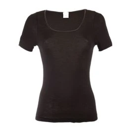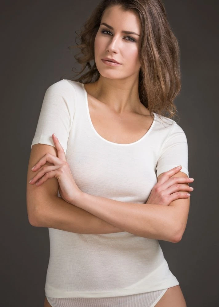 Das Grundmaterial dieser Wäsche Serie ist ein glatter, rundgestrickter Jersey, der in klassischen Farbtönen hergestellt wird. Dieses Material ist hautsympathisch, angenehm zu tragen und hat einen zarten Schimmer. Wolle-Seide wirkt temperaturausgleichend, knittert nicht und trocknet schnell. Sie wärmt im Winter und ist ausgleichend in der Übergangszeit. Außerdem ist dieses edle Material leicht elastisch und passt sich daher gut der Körperkontur an. Da diese Unterwäsche aus einer rundgestrickten „Schlauchware“ gefertigt wird, ist das Kurzarm Shirt seitlich nahtlos.