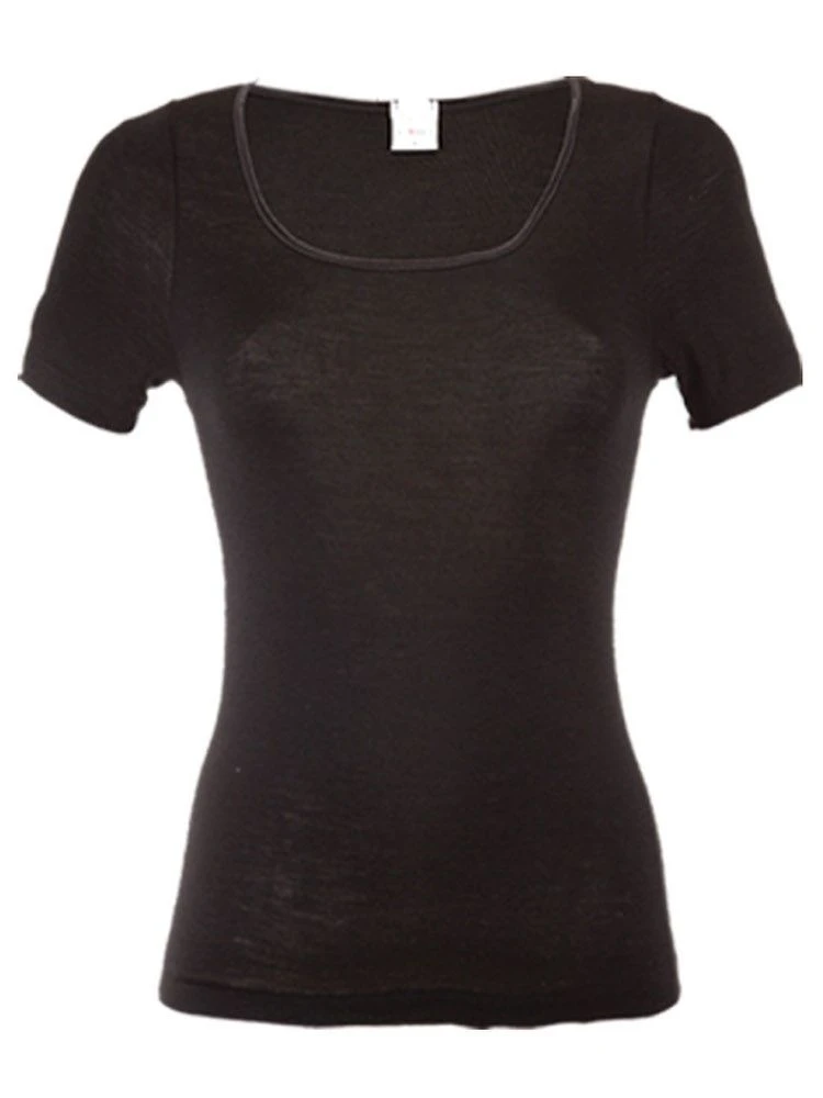 Das T-Shirt Wolle-Seide besteht aus einem besonders hochwertigen glatten Jersey aus 70% extrafeiner Merinowolle und 30% Seide in Kombination mit einer glänzenden Satin-Bordüre. Dieses edle Shirt hat kurze Ärmel und eine Gesamtlänge von ca. 60 cm. Das Decolleté ist mit einer glänzenden Satin-Bordüre eingefasst.