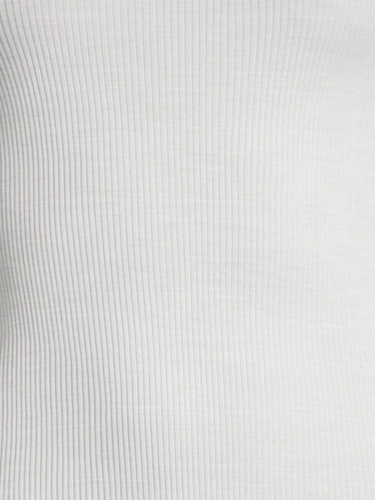 Das Grundmaterial dieser Wäsche Serie ist ein gerippter, rundgestrickter Jersey in schwarz, mokka, haut oder wollweiß. Dieses Material ist hautsympathisch und angenehm zu tragen und hat einen zarten Schimmer. Wolle-Seide wirkt temperaturausgleichend, knittert nicht und trocknet schnell. Sie wärmt im Winter und ist ausgleichend in der Übergangszeit. Außerdem ist dieses edle Material leicht elastisch und passt sich daher gut der Körperkontur an. Da dieses Shirt aus einer rundgestrickten „Schlauchware“ gefertigt wird, ist es seitlich nahtlos.