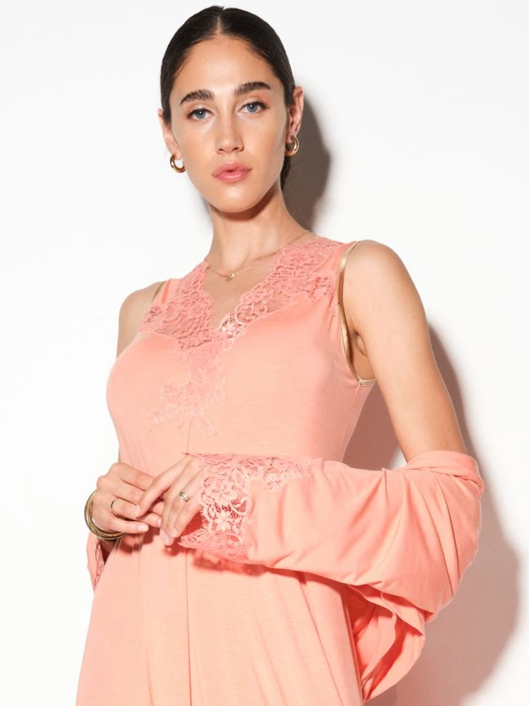 Das wadenlange Nachthemd von Chiara Fiorini besteht aus superweichem Modal in einer hautsympathischen, elastischen Jersey-Qualität (96% Modal, 4% Elasthan). Es ist Made in Italy und in in den Größen 38 bis 46 erhältlich. Dieses ärmellose Nachtkleid ist ca. 120 cm lang und hat einen mit Spitze eingesetzten V-Ausschnitt. Außerdem hat es einen Goldrand aus einem Seidemix (96% Seide, 4% Elasthan) am Saum und an den Ärmeln.