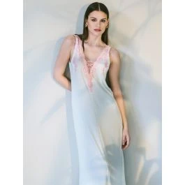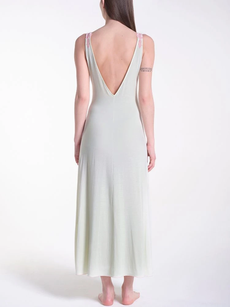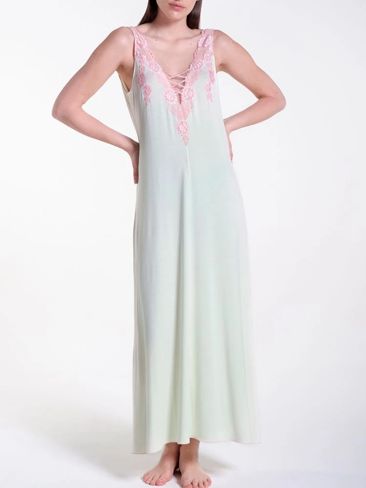Dieses elegante, lange Nachtkleid ist bei uns in zartgrün mit rosa erhältlich.