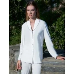 Dieser edle Schlafanzug besteht aus einem superweichen und hochwertigen Modaljersey in Wollweiß. Bei dieser zauberhaften Nachtwäsche aus der modischen Kollektion von Chiara Fiorini sind ausverkaufte Größen nicht nachbestellbar.