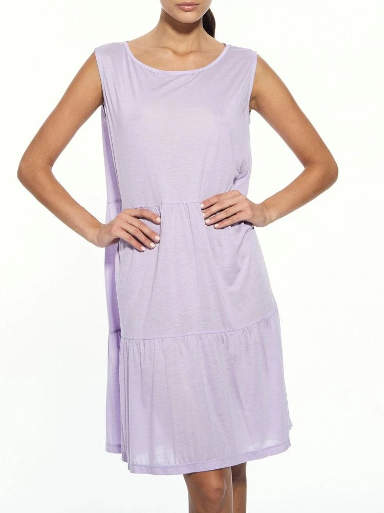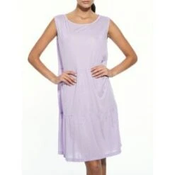 Das Nachthemd hat breite Träger, ist ca. 98 cm lang und ist in der Farbe Flieder in den Größen 36 bis 44 erhältlich.