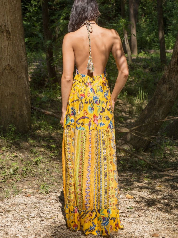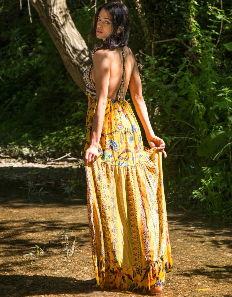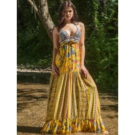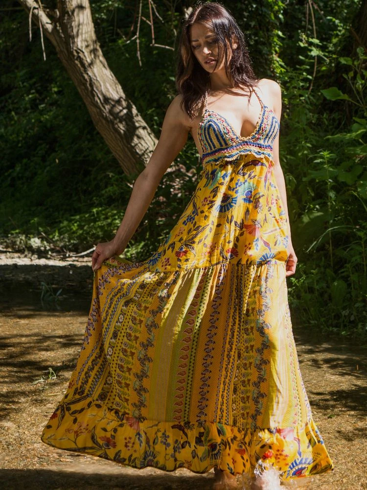 Das lange Strandkleid Adelia der italienischen Luxus-Marke Laetitia Beachwear ist aus feinem Batist (65% Baumwolle, 35 % Seide) gefertigt. Das exklusive Kleid ist in einem Mustermix mit floralen Mustern gearbeitet und in echter Handarbeit ist das Oberteil gehäkelt. Das Kleid hat ein neckholder Kordelbändchen zum Binden, welches in fransigen Quasten endet.