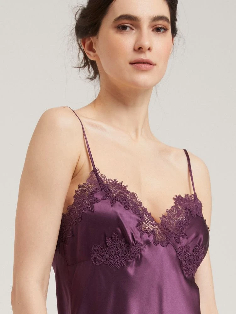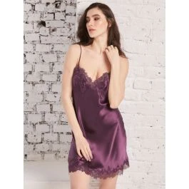 Dieses modische Seiden-Neglige ist aus hochwertigem Seidensatin (100 % Seide) gefertigt. Das kurze Seiden-Neglige (Länge ca. 90 cm) ist am Saum und am oberen Saum umlaufend mit floraler Makramee-Spitze besetzt. Diese edle Seidennachtwäsche des italienischen Nachtwäsche Labels Vivis ist ausdrucksstark, feminin und elegant und intensivem Pflaume-Violett erhältlich.