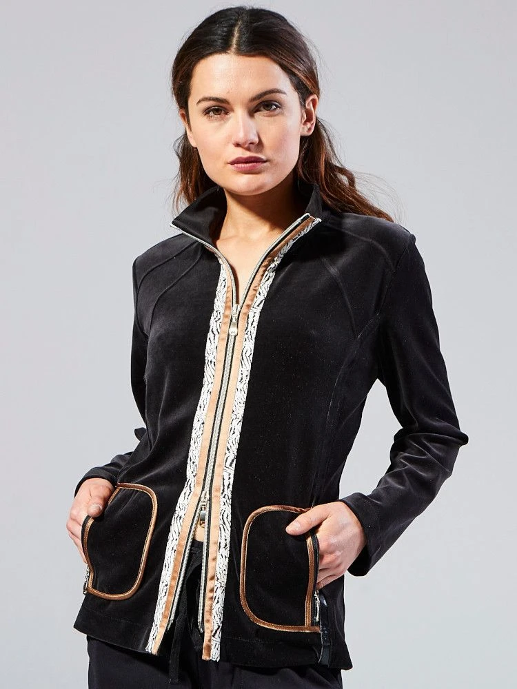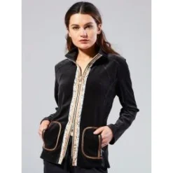 Der Hausanzug Sky Lodge gibt es bei uns in schwarz mit Tigermuster. Die Jacke ist mit Taschen und beigem Kunstleder verziert. Der Hausanzug ist in den Größen 36 bis 48 erhältlich.