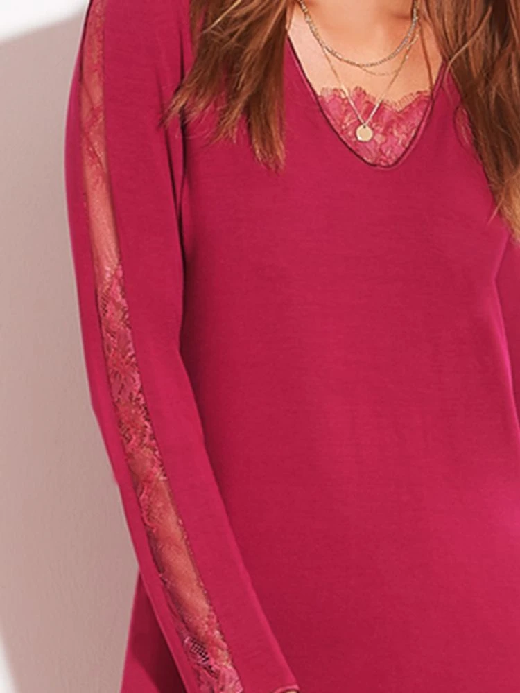 Der lange Damen-Pyjama von Chiara Fiorini besteht aus superweichem Micro-Modal in einer hautsympathischen, elastischen Jersey-Qualität (95% Modal, 5% Elasthan). Er ist Made in Italy und in den Größen 34 bis 48 erhältlich. Dieser Pyjama hat ein ca. 75 cm langes Oberteil mit langen Ärmeln und Spitzeneinsatz. Das Oberteil hat einen V-Ausschnitt mit floralem Spitzendetail. Die zugehörige Hose hat gerade Beine und einen Gummibund.