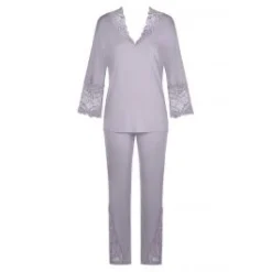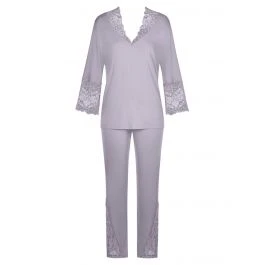 Der Pyjama wirkt feminin und elegant und ist etwa knöchellang. Die Hochwertigkeit dieser edlen Wäscheserie wird durch Accessoires in Roségold-Metallic unterstrichen. Erhältlich in der Farbe flieder mit Spitze.