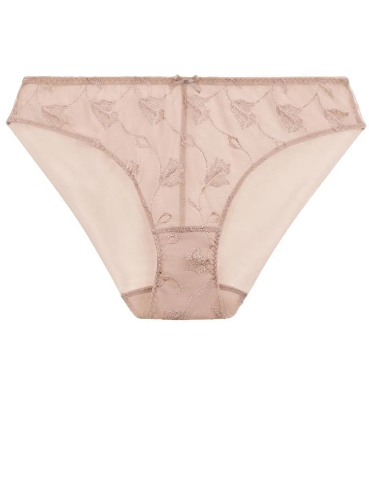 Der Rioslip ist aus Tüll und bestickter Tüllspitze gefertigt. Der Tüll ist hinten in Futteralverarbeitung verwendet für besonders flache Kanten. Der Slip ist semitransparent und hat einen Innenzwickel aus Baumwolljersey.