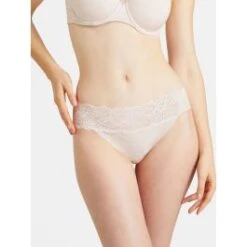 Der Slip in Bikiniform hat Laser Cut Kanten und ist seitlich nahtlos, für einen besonders flachen Look. Der Bund ist mit Spitze verziert und der Slip hat einen Innenzwickel aus Baumwolljersey.