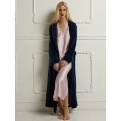 Dieser kuschelige, lange Samt-Morgenmantel ist aus einem ganz besonderen Material gefertigt: Kuscheliger Samt (82% Viscose, 18% Seide) ist zu einem wunderschönen Winteraccessior mit bequemem Schnitt geworden. Der lang geschnittene Samtmantel wird gewickelt getragen und mit einem Bindegürtel geschlossen. Er hat einen Reverskragen, ist ca. 140 cm lang und hat auf beiden Seiten Manteltaschen aufgenäht.