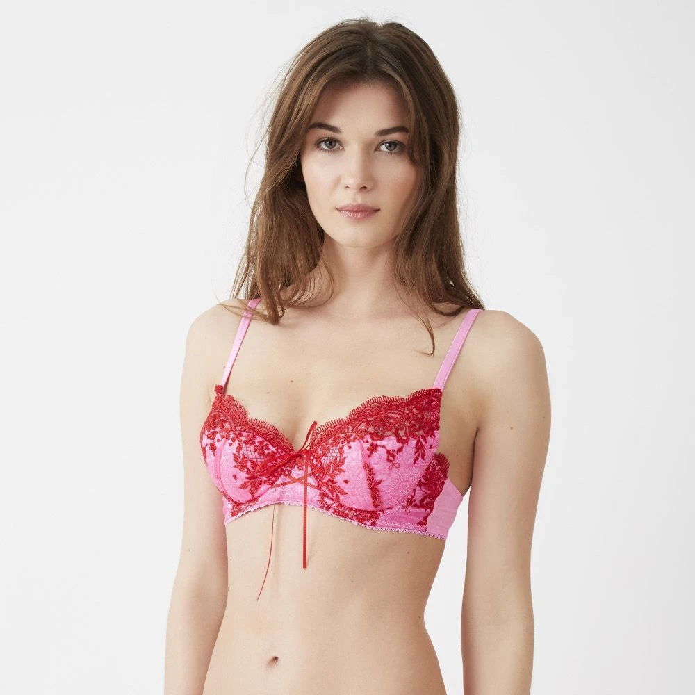 Der leicht gefütterte Schalen-BH besteht aus elastischem Seidensatin und Spitze. Die glatten Schalen-Cups (mit Bügel) sind leicht geschäumt abgefüttert und an der Vorderseite mit rot bestickter Spitze benäht. Die Träger sind elastisch und längenverstellbar und auf der Rückseite wird der BH mit einem einfachen Häkchenverschluss (vierfach verstellbar) geschlossen. Seitlich besteht der BH aus elastischem Tüll und auf der Innenseite hat er ein Futter aus Baumwolljersey.